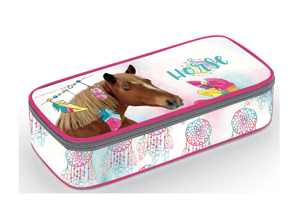 Puzdro etue Komfort kôňŠkolské puzdro etue s pevným zipsom, má vo vnútri vrecko na zips a klopnu s pevnými pútkami po oboch stranách. Pod chlopňou je miesto na voľné uloženie písacích potrieb alebo iných drobností. Vhodné pre školákov na 2. stupni a starších študentov. Veľkosť: 22 x 10 x 5 cmMotív: kôňBez náplne - prázdny