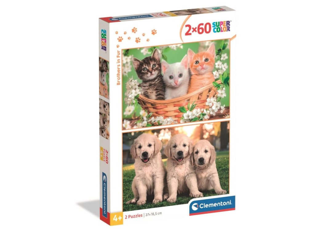 Puzzle 2x60 Brothers in Fur ClementoniObrázkové detské puzzle, ktoré si môžu deti poskladať z 2 x 60 dielikov. Sú ideálne pre učenie farieb, tvarov a vzorov, a poskytujú zábavu, ktorá trvá hodiny. Clementoni je jedným z najväčších výrobcov puzzle na svete. Presnosť jednotlivých dielikov, optimálne rozlíšenie pri tlači a odolnosť materiálu potvrdzujú dlhoročnú kvalitu týchto výrobkov. Prednosti: trénujú vizuálnu pamäť, jemnú motoriku, učí manuálnej zručnosti a trpezlivostiPočet dielov: 2 x 60 ks (2 obrázky)Rozmery obrázka: 27 x 19 cmOdporúčaný vek : 4+