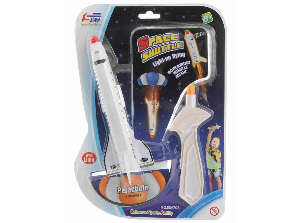 Raketoplán vystreľovací 20 cmVystreľovací raketoplán so svetlom a zvukom. Raketa pri lete hvízda a svieti. Napájanie: 2x gombíková batéria (AG3) - je súčasťou baleniaRozmer rakety: cca 20 cm Vek: 8+
