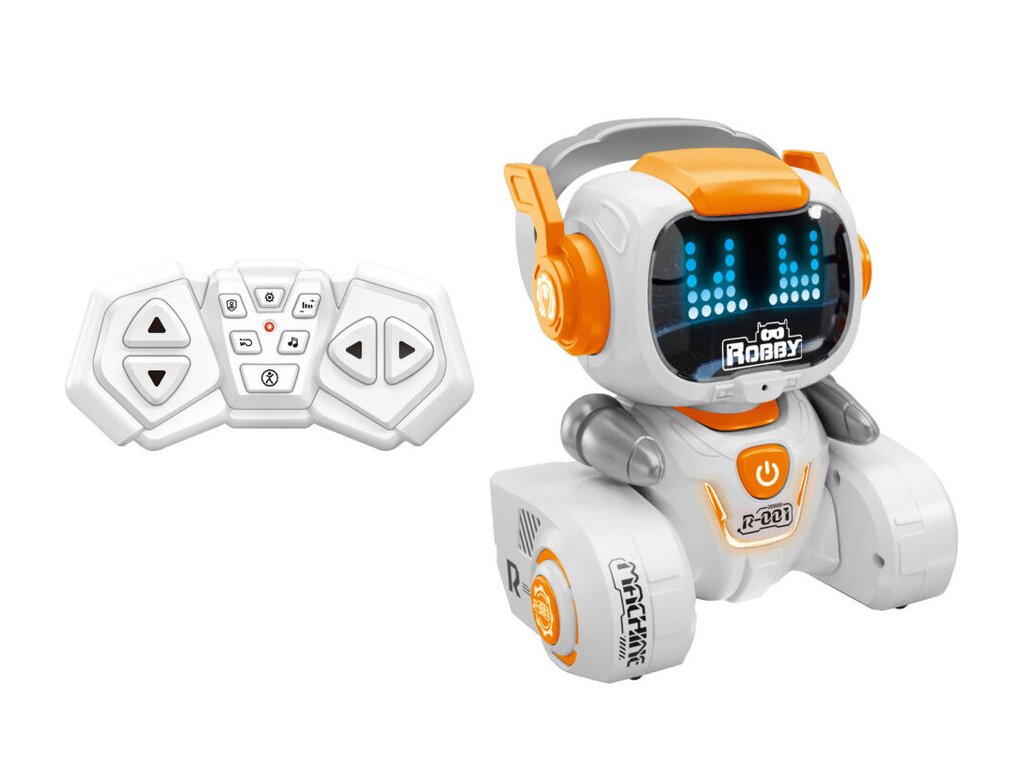 Robot Robby RC na diaľkové ovládanie Interaktívny robot Rooby so svetelnými a zvukovými efektmi. Ovládač ponúka pohyb dopredu a dozadu, otáčanie robota vľavo a vpravo, tanec, programovanie, ovládanie hlasitosti, demo režim, zvukové efekty (hudba). Svetelné a zvukové efektyFrekvencia: 2,4GHzNapájanie: batériový pack 3.7V 350mAh Lítium do robota súčasťou, 2xAAA do ovládača nie sú súčasťouVhodné od 8+Zasielamé náhodným výberom, nie je možnosť vybrať farbu.