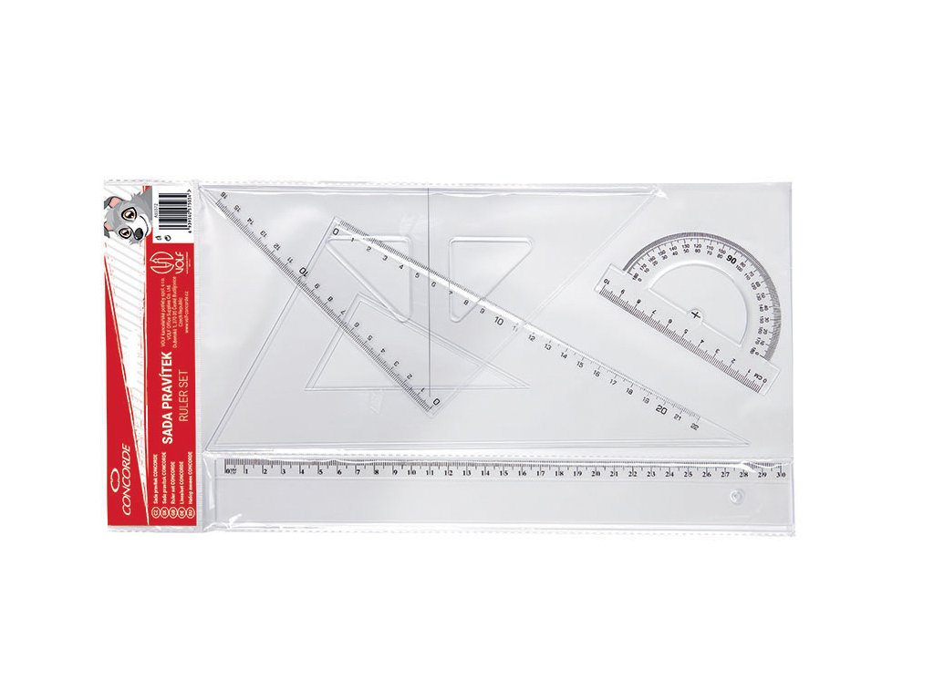 Sada pravítok ConcordeSada 4 kusov pravítok: pravítko so stupnicou 30cm, trojuholník s ryskou so stupnicou 16 cm/45°, trojuholník so stupnicou 22cm /60°, uhlomer so stupnicou 10cm /180°. Dodávaná v plastovom obale.