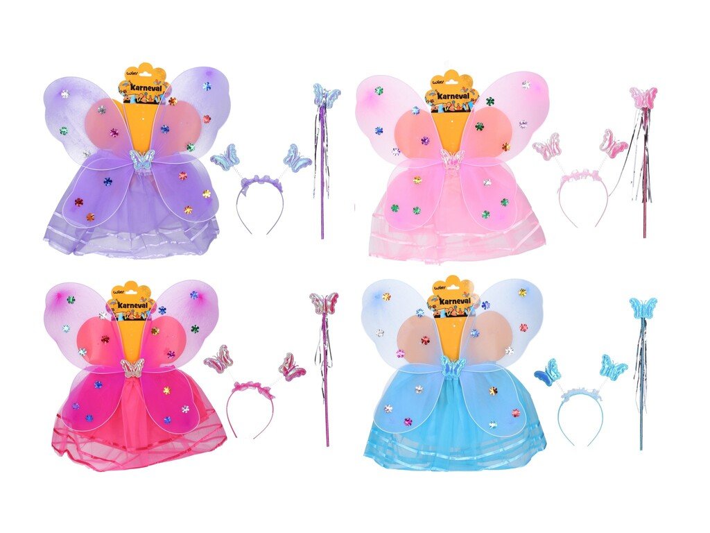 Set karneval víla rôzne farbyKarnevalový set - víla. Obsahuje: suknu, krídla, paličku, čelenku s tykadlamiDĺžka sukne: 30 cmFarby: fialová, modrá, svetlo ružová, tmavo ružová