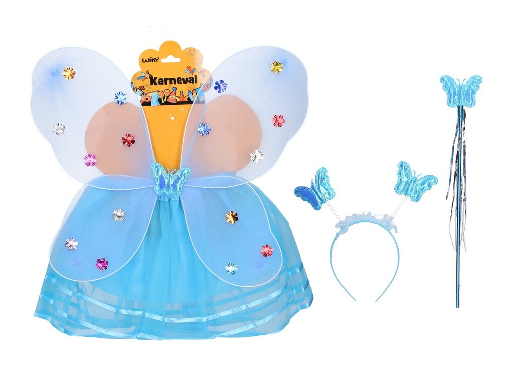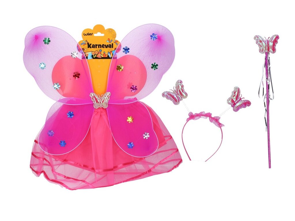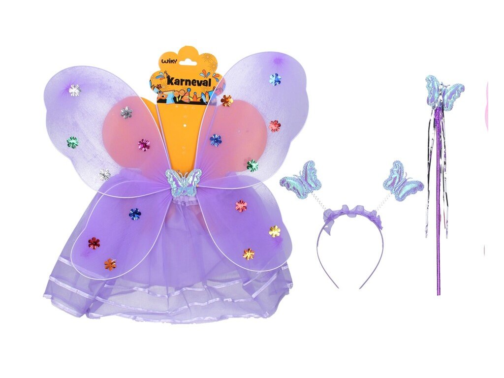 Set karneval víla rôzne farbyKarnevalový set - víla. Obsahuje: suknu, krídla, paličku, čelenku s tykadlamiDĺžka sukne: 30 cmFarby: fialová, modrá, svetlo ružová, tmavo ružová