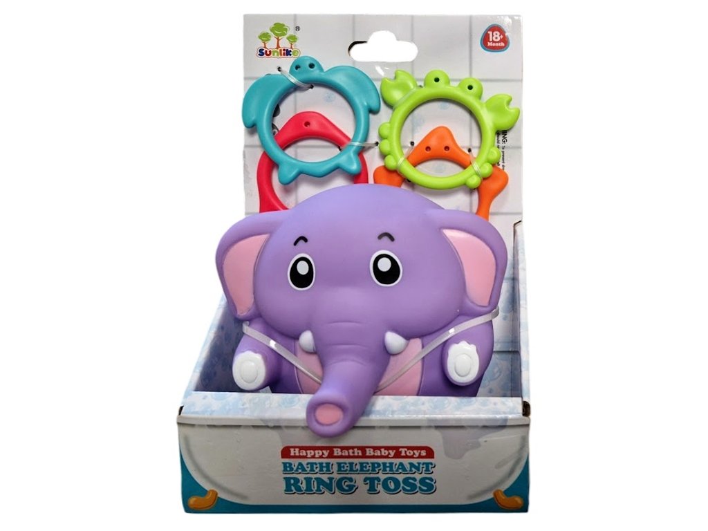 Slon s krúžkamiSlon s krúžkami do vane. Obsahuje plávajúceho slona a 4 krúžky na hádzanie na chobot slona. Rozmery 13 x 10 x 11 cm