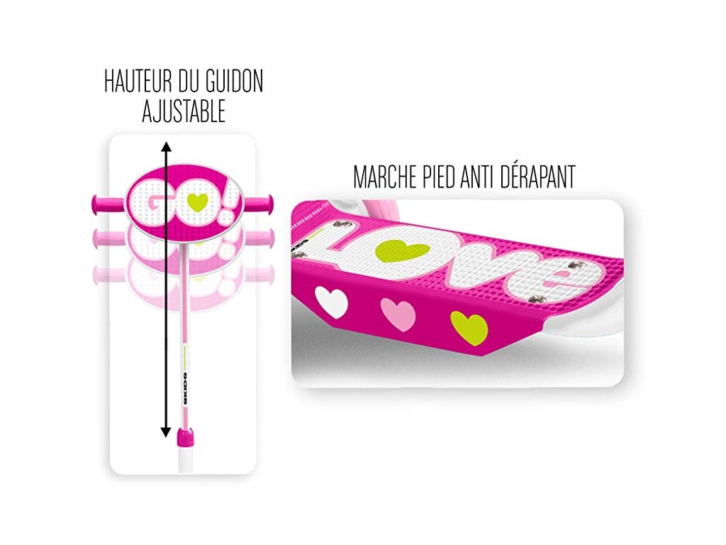 Stamp Kolobežka Love 3-kolesováStabilná kolobežka pre najmenšie deti. Kolobežka je vybavená tromi kolieskami pre lepšiu stabilitu Kolobežka má stabilnú protišmykovú podložku s krásnym obrázkom, aby bola zabezpečená čo najbezpečnejšia jazda pre vaše dieťaMadlá kolobežky sú protišmykové a zároveň príjemné na dotykKolobežka má na riadidlách ozdobu s nápisomKolobežka má výškovo nastaviteľné riadidláNosnosť 20 kgVhodné pre deti 2 - 4 roky