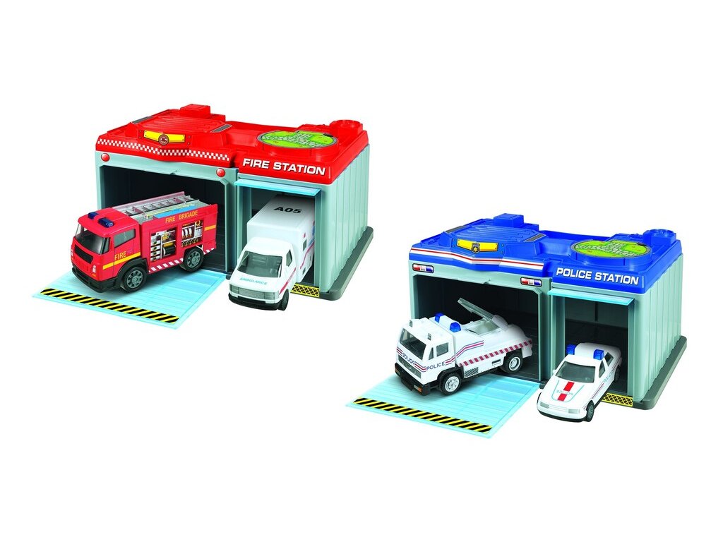 Stanica prenosná s 2 kovovými autamiPolicajná alebo hasičská stanica? Súčasťou prenosnej stanice sú 2 kovové autíčka. Rozmery stanice: 24 x 15,5 x 12,5 cmVeľkosť áut: cca 13 cmNa výber: poliícia, hasičiMateriál: kov/plastBalené v krabici