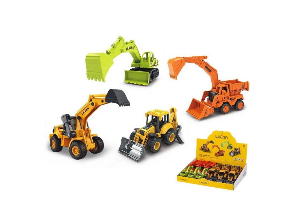 Stavebný stroj na zotrvačník 20cmPracovný stroj s pohyblivými časťami, ako lyžica bágra alebo vyklápanie. Rozmery: 20 x 7,2 x 12 cm4 varianty. traktor s nakladačom a bagrom, báger s pásom, báger na koliekach, auto nakladač