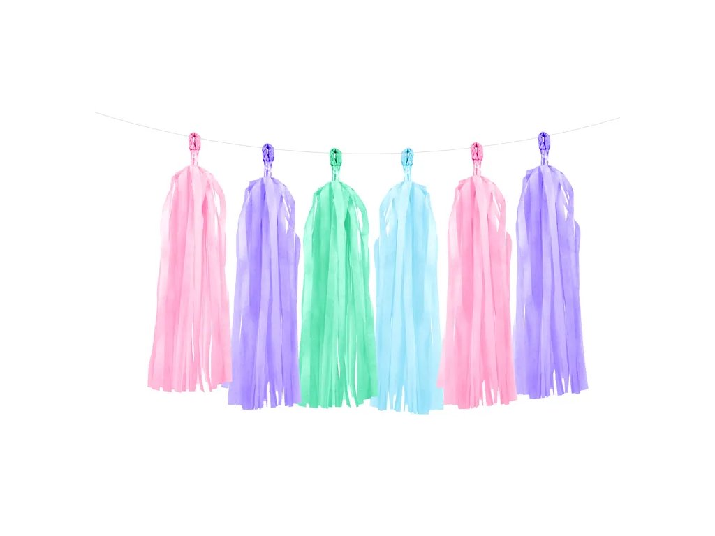 Strapcová girlanda, sada obsahuje 12 strapcov (ružový, nebesky modrý, zelený, fialový, po 3 ks) a cca. 2 m bieleho špagátu, veľkosti po zložení: výška cca. 30 cm, dĺžka cca. 1,5 m.