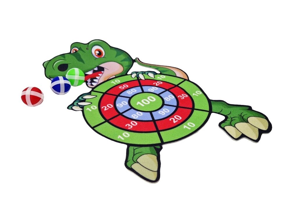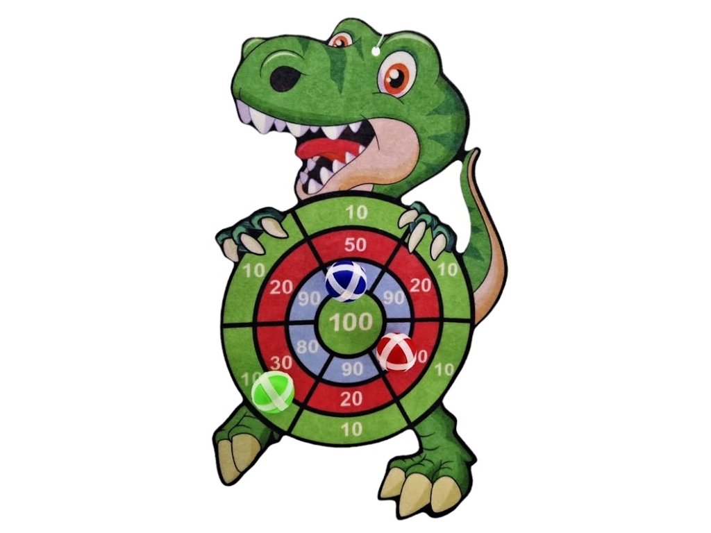 Terč s loptičkami Dino na suchý zipsTerč s motívom dina z pevnej látky na zavesenie na háčik. Súčasťou balenia je háčik na nalepenie a loptičky na suchý zips. Veľkosť: 43 cmBalenie obsahuje: terč, háčik a 3 loptičkyVhodné od 3+