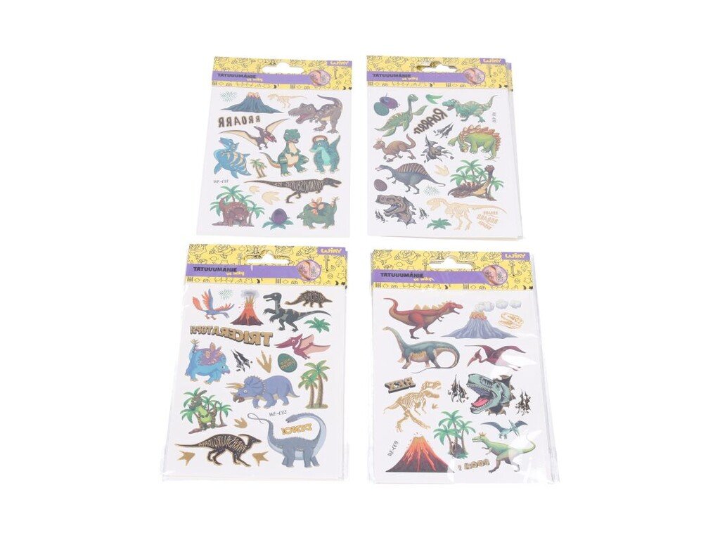 Tetovacie detské nálepky DinosaurusDetské zmývateľné tetovačky s motívom Dnosaura. Balenie obsahuje niekoľko ks tetovačiek. Tetovačky sa jednoducho aplikujú pomocou vody a rovnako jednoducho sa odstraňujú. Veľkosť blistra 11,5 x 18,5 cmUvedená cena je za 1 blisterMix motívov. Zasielame náhodným výberom. Ak si želáte konkrétny motív, napíšte do poznámky k objednávke.