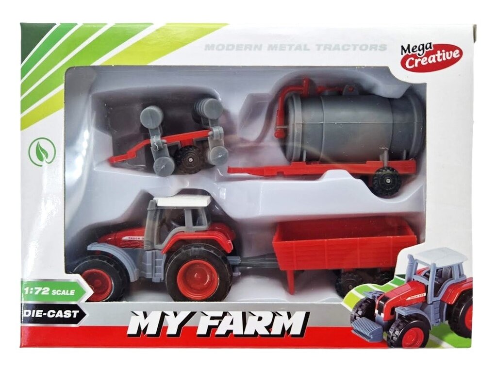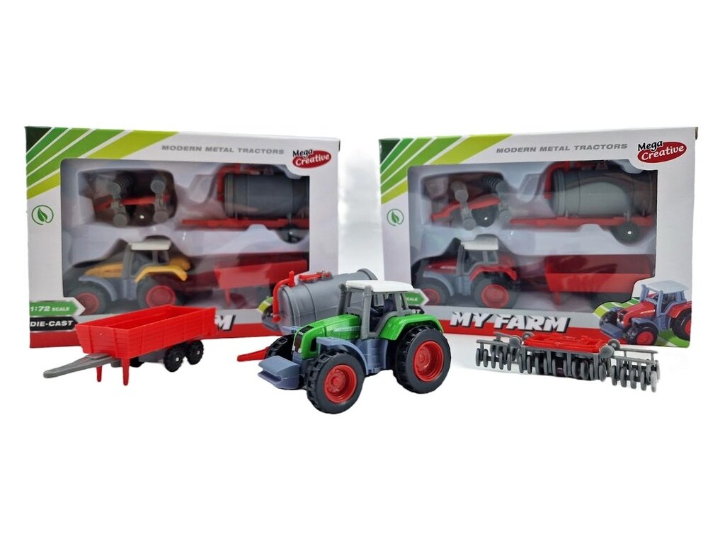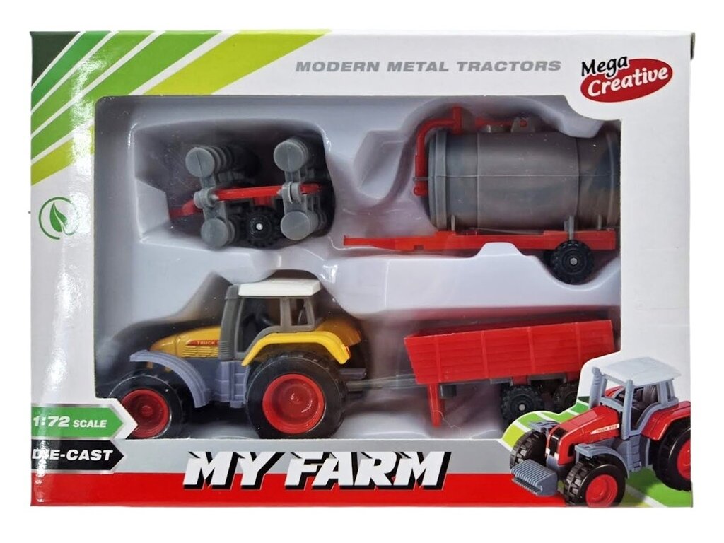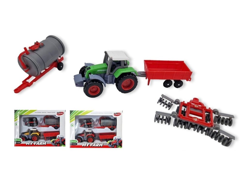 Traktor s prívesom 1:72Malý moderný traktor s rôznymi variantami prívesov pre malých poľnohospodárov. Veľkosť traktora: 6,5 x 4 cmMateriál: kov / plastDĺžka prívesu: cca 4-8 cm Vhodné pre deti od 3+