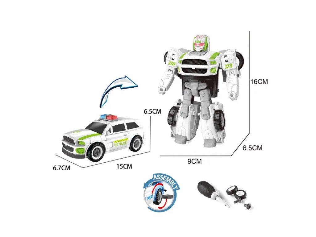 Transformer 2v1 autorobot polícia šróbovacieRobot sa premení na auto pomocou skrutkovača. Tento typ práce s detailmi aktívne trénuje motoriku rúk a rozvíja priestorové a logické myslenie. A zaujímavé hry s robotickým autom dokonale odhaľujú schopnosti predstavivosti a fantázie. Nepotrebujete batérieOdporúčaný vek 5+Veľkosť auta: 17 x 7 x 6 cmVeľkosť robota: 16 x 11 x 5 cm