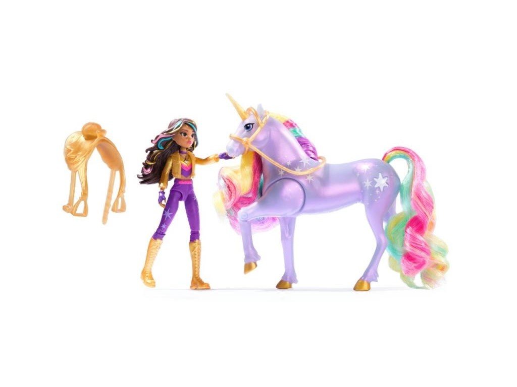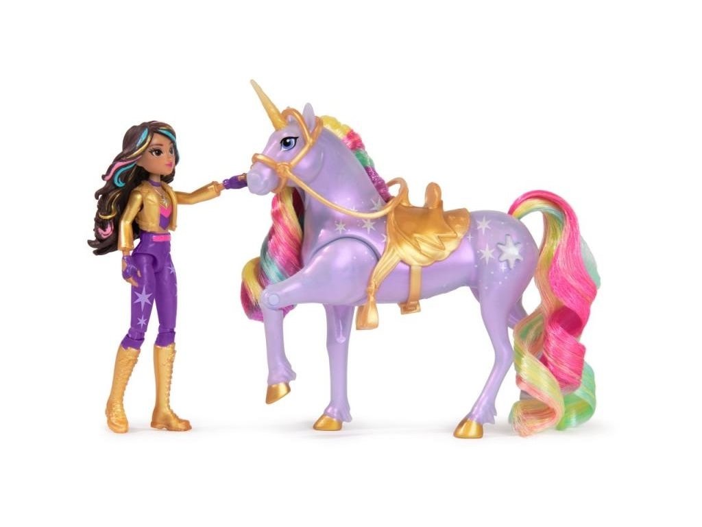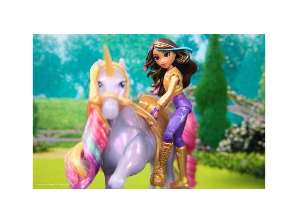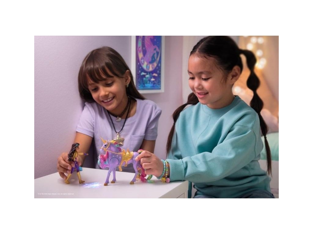 Unicorn Academy Sophia a Light Magic Wildstar figúrkyZažite čaro Jednorožej akadémie vďaka Sofii a Polárke so svetelnou mágiou! Toto duo inšpirované animovaným programom od NETFLIXu a bestsellerovou knižnou sériou, kde priateľstvo drží opraty osudu, oslavuje jedinečné puto medzi jazdcom a jednorožcom.Táto sada podnecuje kúzelnú kreatívnu hru vďaka Polárke, ktorá sa chváli vernými detailmi, mäkkou dúhovou hrivou a chvostom a skutočnými svetelnými efektmi. Vďaka 7 kĺbom je možné Sofiu posadiť na Polárku a stlačením tlačidla s hviezdičkou na Polárkinej strane je možné aktivovať svetlá a prehrať si svoje obľúbené scény z programu (súčasťou balenia sú 3 batérie LR44). Keď Polárka dupne kopytom, vytvorí pomocou svetelnej mágie dúhový vzor, presne ako v seriáli! Vďaka odnímateľnej uzde a sedlu zostane Sofia bezpečne na chrbte Polárky. Ak chcete objaviť všetky spôsoby, ako si užiť svet Jednorožnej akadémie so svojimi obľúbenými postavami, si prezrite ďalšie malé bábiky, ako sú Ava, Layla, Isabel a Valentina spolu s ich jednorožcami (sady sa predávajú samostatne), rozšírte svoj čarovný svet! Prežite vlastné žiarivé dobrodružstvo z Jednorožčej akadémie vďaka Sofii a Polárke so svetelnou mágiou!Odporúčaný vek : 4+