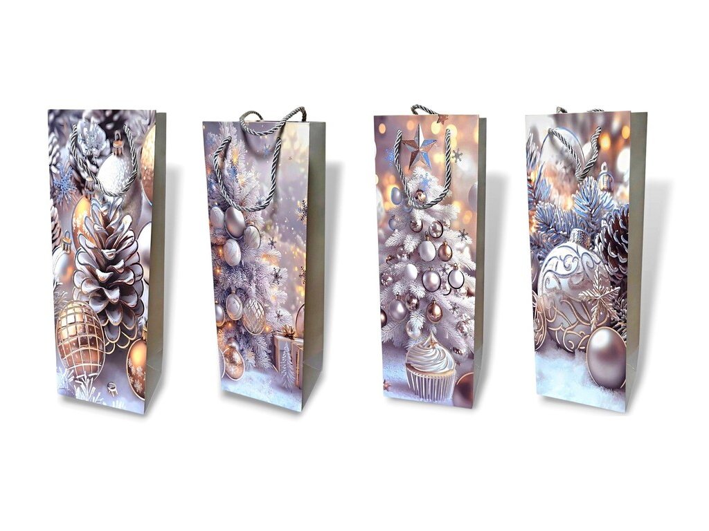 Vianočná darčeková taška na fľašuDarčeková vianočná taška vyrobená z kvalitného tvrdého papiera, vhodná na jednoduché balenie suvenírov a darčekov. Rozmery : 12 x 9 x 35 cmUvedená cena je za 1 ksPosielame náhodným výberom podľa skladovej dostupnosti. Ak si želáte konkrétny motív, napíšte do poznámky pri objednávke.V prípade záujmu o celé balenie obsah 12 ks mix motívov