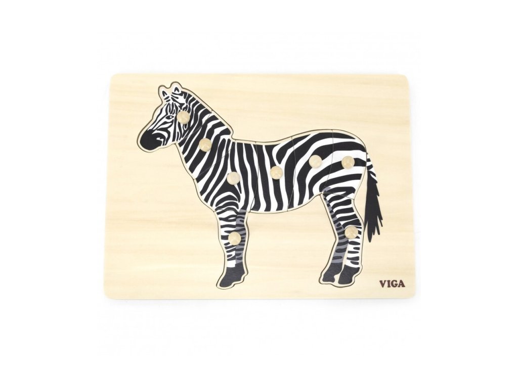 Viga Drevená vkladačka ZebraZábava inšpirovaná metódou Márie Montessori umožňuje malým deťom spoznávať zvieratká, stimuluje gesto, dotyk, rozvíja vnímanie tvarov a zmysel pre priestor. Tento multisenzorický prístup podporuje dôkladnejšie učenie, ktoré je veľmi dôležité pre kognitívny rozvoj. puzzle sa skladajú z 8 prvkov s úchytkami,úlohou dieťaťa je poskladať zebru z dostupných prvkov tak, aby zodpovedal nielen obrázku, ale aj tvaru príslušných prvkov,úchytky uľahčujú malým ručičkám chytanie a držanie dielikov skladačky,zozbierajte celú sériu zvieracích puzzle.Rozmer drevenej dosky cca 30 x 22,5 cmVek 18m+