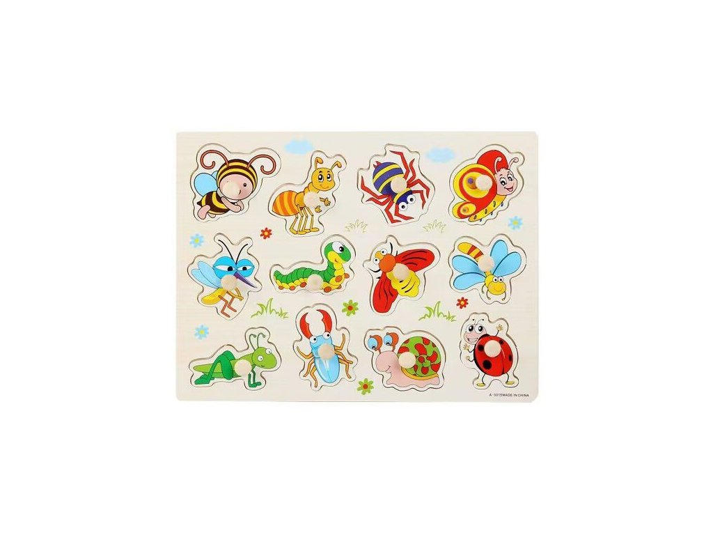 Vkladačka drevená hmyz 12 ksJednoduchá vkladačka s drevenými puzzle dielikmi s motívom hmyzu. Vlož vkladačku na správne miesto na podložkeSkladaním puzzle si deti precvičujú jemnú motoriku a techniku úchopu Veľkosť podložky: 30 x 22,5 x 0,5 cm