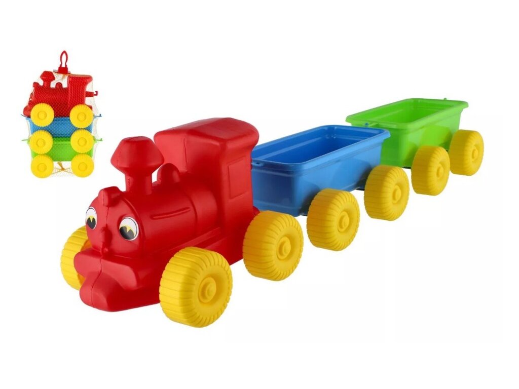Súprava lokomotívy s vagónmi.Krásny vláčik na ťahanie, ktorý má červenú lokomotívu a dva vagóny do ktorých si dieťa môže naložiť náklad a ťahať za sebou. Vagóny sa dajú odpojiť a použiť samostatné. Vláčik je vyrobený z kvalitného plastu, ktorý spĺňa európske normy kvality. Veľkosť: 60 x 15 x 15 cm