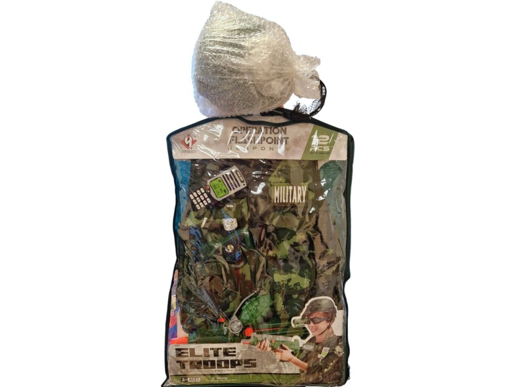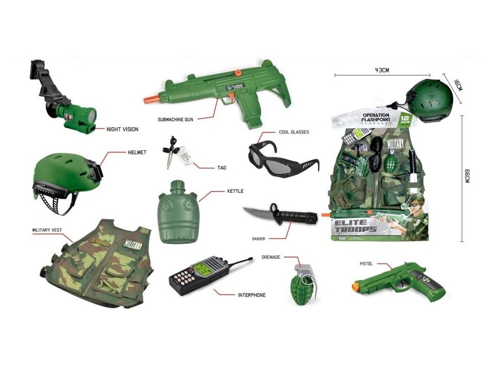 Vojenská sada s prilbouSada pre vojakov: uniforma, helma, svietidlo s ďalekohľadom na helmu, samopal, pištoľ, nôž, granát, okuliare, vysielačka, odznak a fľaša. Vhodné ako kostým vojaka na karnevalOdporúčaný vek 3+