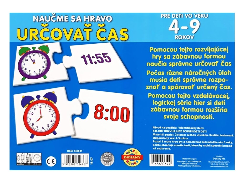 Vzdelávacie hry pre najmenších MIX 2 druhyHry vo veselých farbách vhodné pre deti od 3 do 9 rokov. Náučná hra pre najmenších sa postará o hodiny plné zábavy, ale aj učenia sa o hodinách a čase počas dlhých zimných či letných večerov. Naučme sa hravo určovať čas - Zábavnou formou sa deti naučia určovať čas. Počas rôzne náročných úloh musia deti správne rozpoznať a spárovať určený čas.Naučme sa hravo profesie - Počas určených úloh musia rozpoznať a spárovať figúrky patriace k rôznym profesiam.