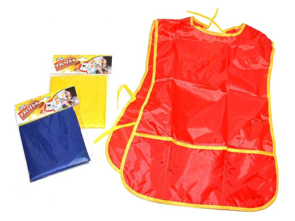 Zástera obojstranná Obojstranná zástera na výtvarnú výchovu má zaväzovanie v páse, na prednej časti má 3 kapsičky. Už žiadne zašpinené tričká ani nohavice pri maľovaní vašich ratolestí. Veľkosť: M (50 x 38 cm)Uvedená cena je za 1 kusV prípade balenia obsah 12 ks