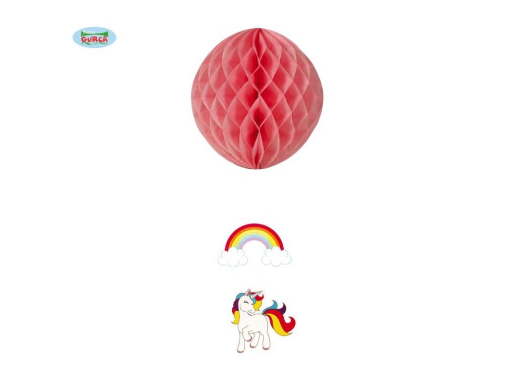 Dekorácia sa skladá z ružovej Honeycomb gule, Jednorožca a dúhy.