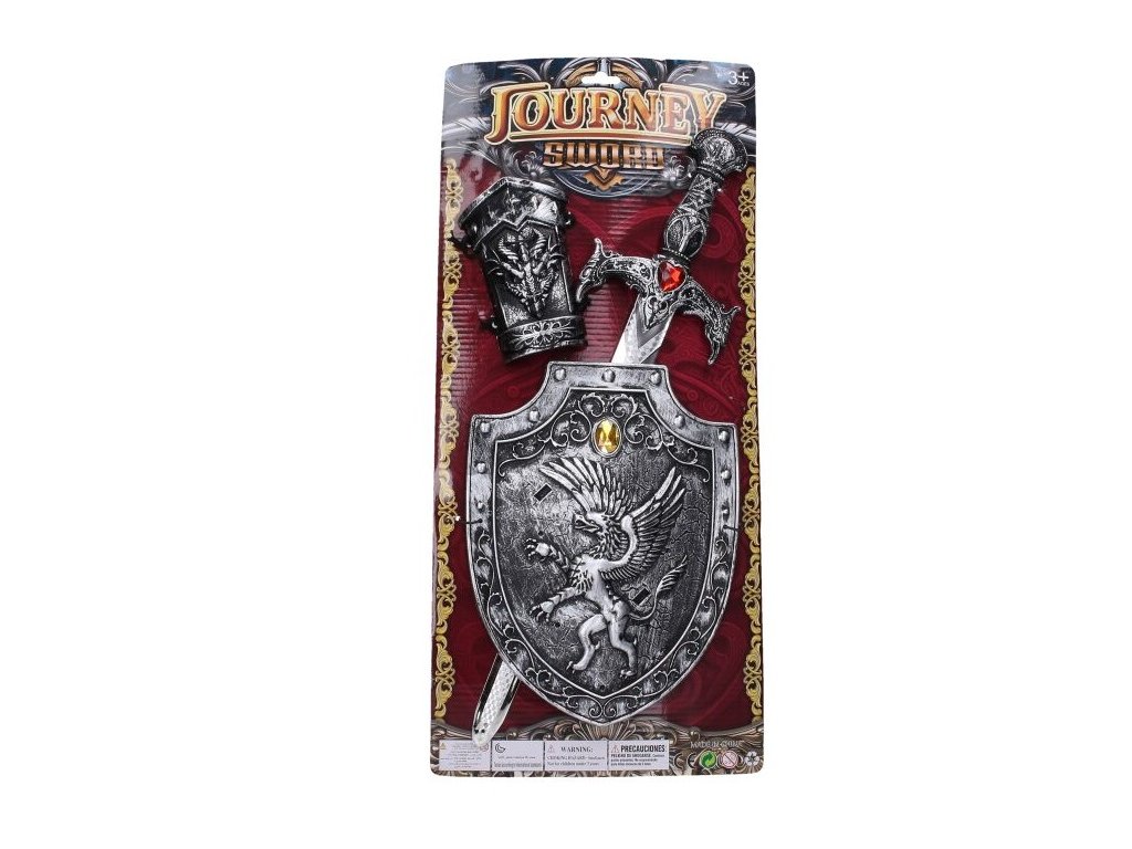 Zbrane nátepník, štít, meč 50cmStrieborná rytierská sada pre malých rytierov. Vhodná aj ako karnevalový doplnok.Veľkosť meča: 50 cm