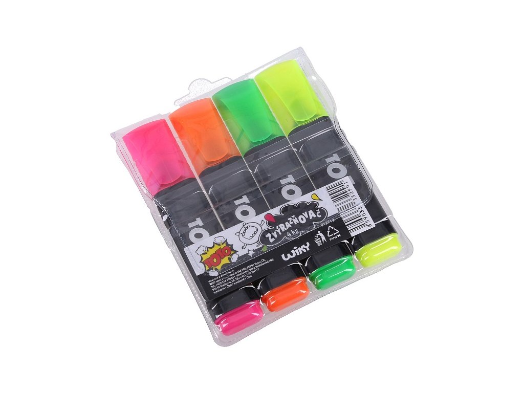Zvýraznovače 4 farbyZvýraznovače so živými a žiarivými farbami. Rýchloschnúce Upozornenie: Nevhodné pre deti do 3 rokov, pre obsah malých častí. Balenie : 4 ks